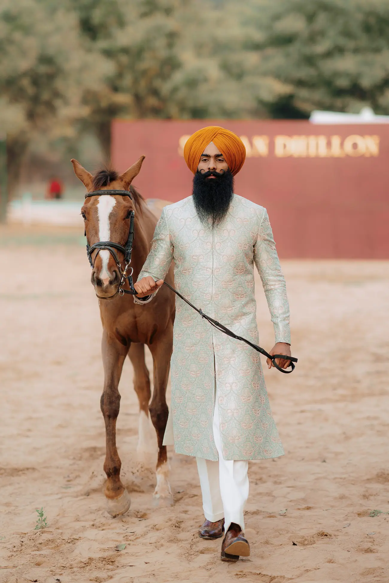 Opulent Regal Brocade Sherwani featuring an intricate scallop motif in champagne gold threadwork over a soft mint base, this sherwani exudes heritage charm with contemporary finesse. The clean mandarin collar and concealed placket complete the structured silhouette, ideal for wedding ceremonies or high-formal occasions.