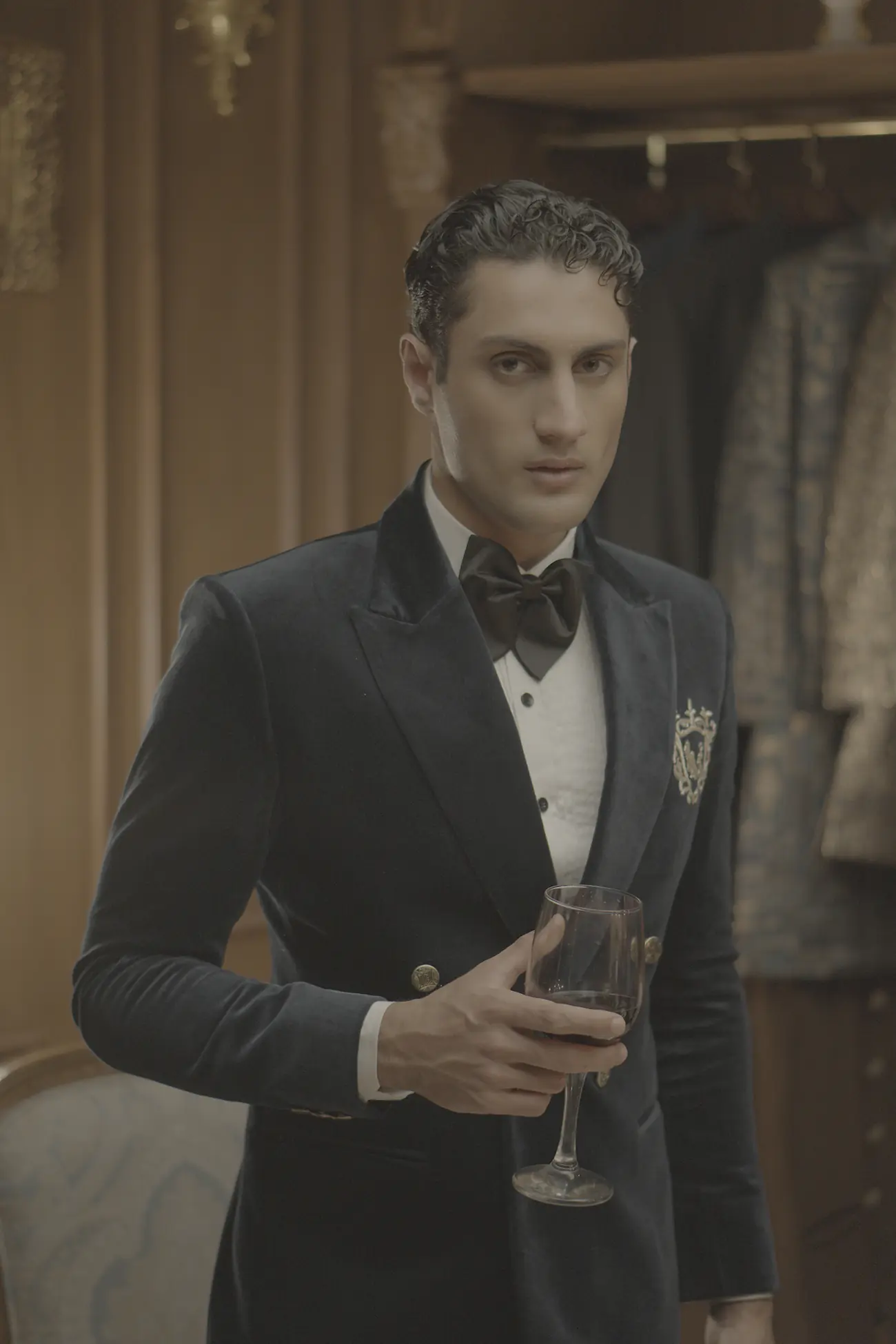 Black velvet tux adorned with patch pocket having embroidery on chest making it stabd out piece and perfect for any ocassion.