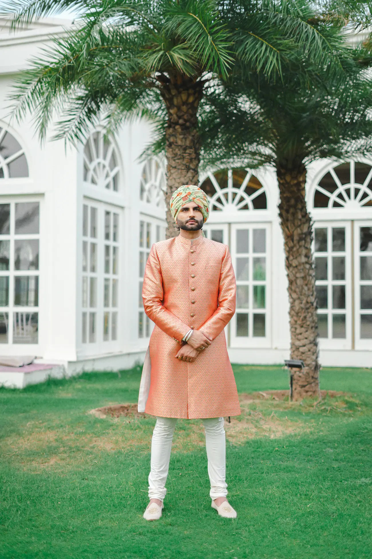 Self orange achkan its sewing pattern compliment its paired with churidaar pyjami perfect for any mehehndi and haldi function.