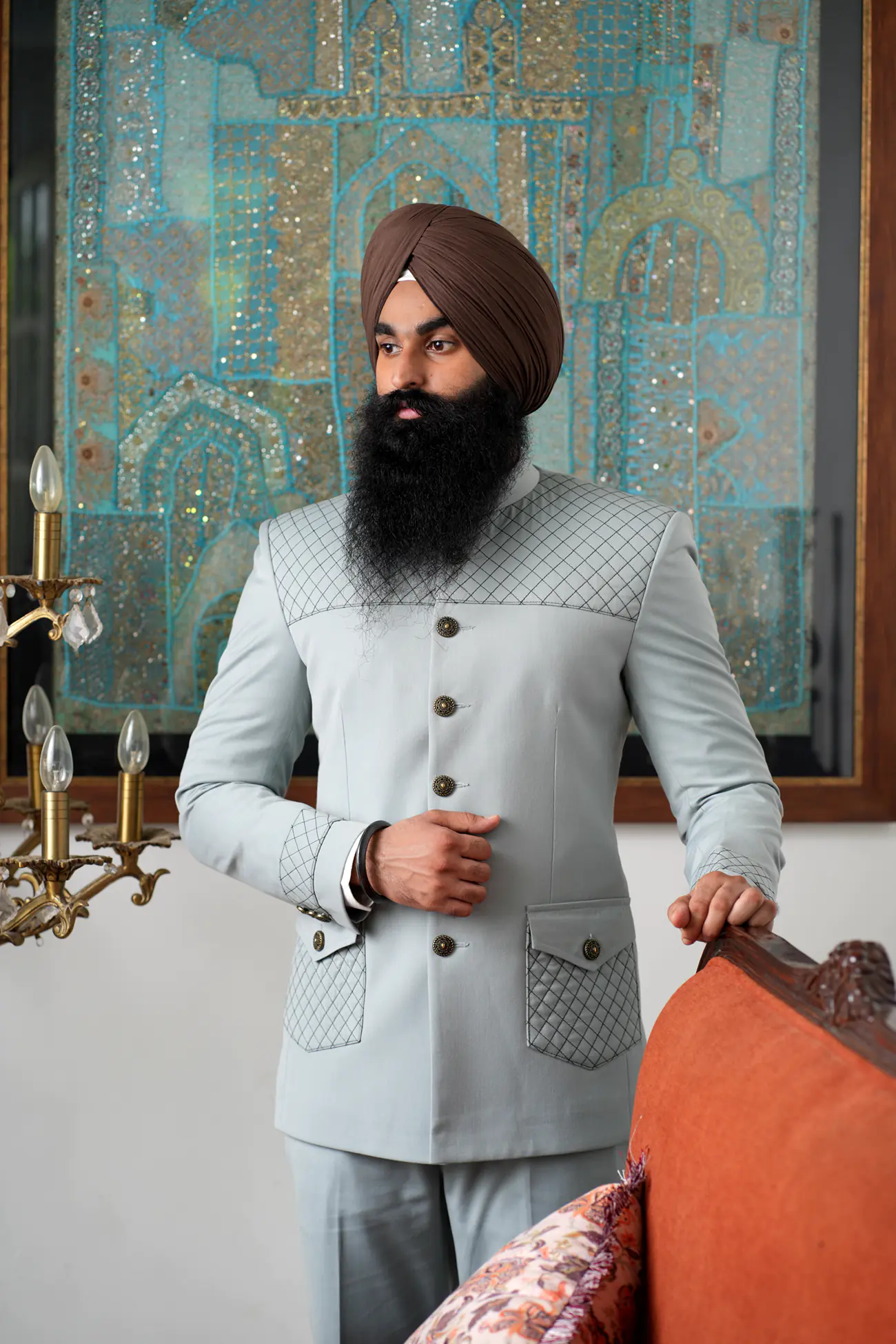 A powerful blend of structure and sophistication, the Quilted Army Bandhgala is crafted in a deep olive tone with subtle quilting on the shoulders for a modern militaristic edge. Designed for the confident gentleman, this piece elevates traditional tailoring with sharp lines and a commanding fit.