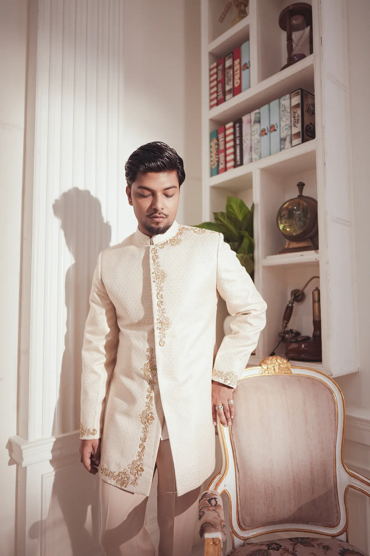 Crafted for ceremonial elegance, the Royal Gold Radiance Bandhgala by Simran Dhillon is tailored in a luxurious ivory jacquard base, highlighted with intricate golden embroidery along the placket, cuffs, and hemline. The rich texture and refined detailing evoke a regal aura, making it a perfect choice for engagements, weddings, and high-formal occasions.