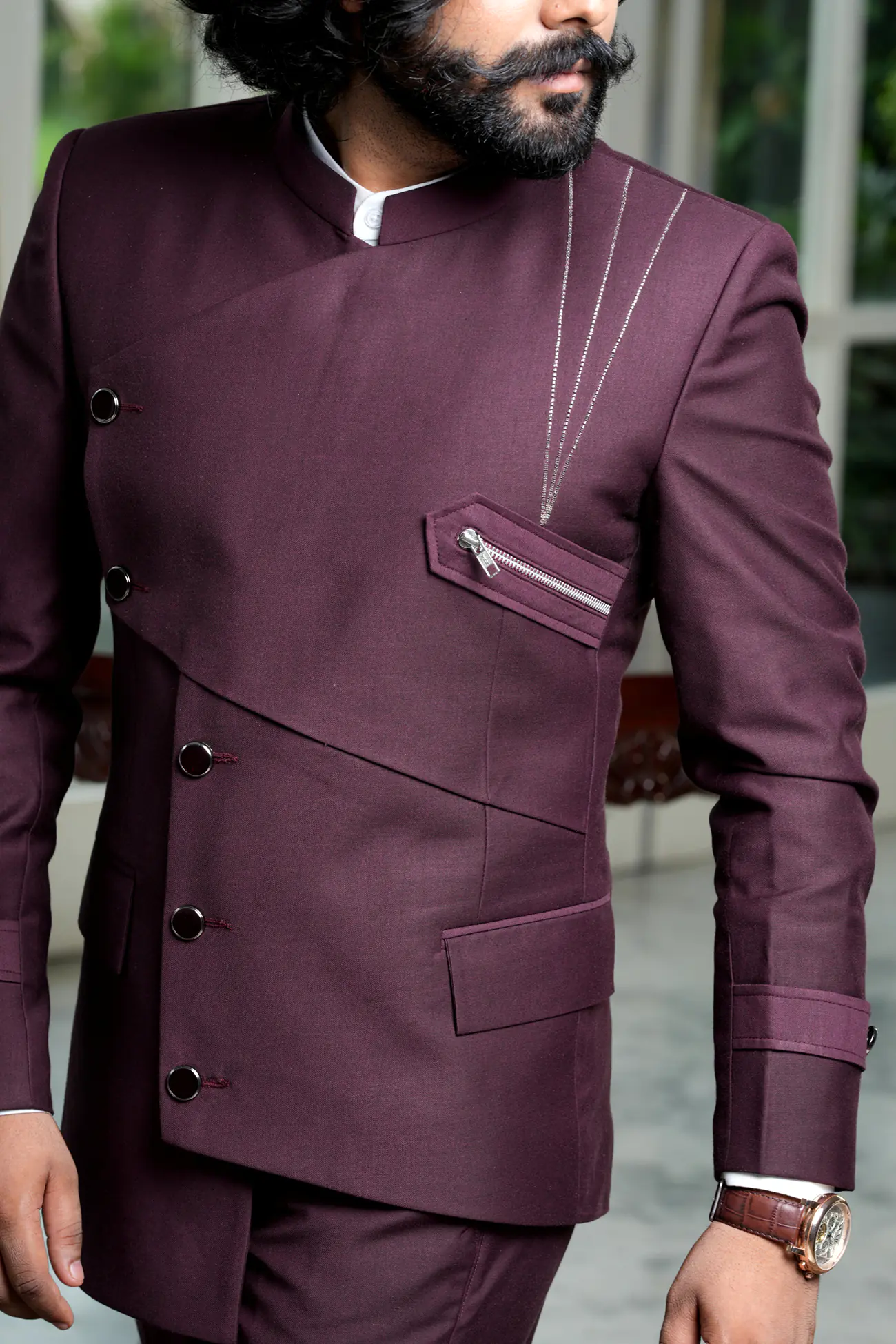 Black velvet tux adorned with patch pocket having embroidery on chest making it stabd out piece and perfect for any ocassion.