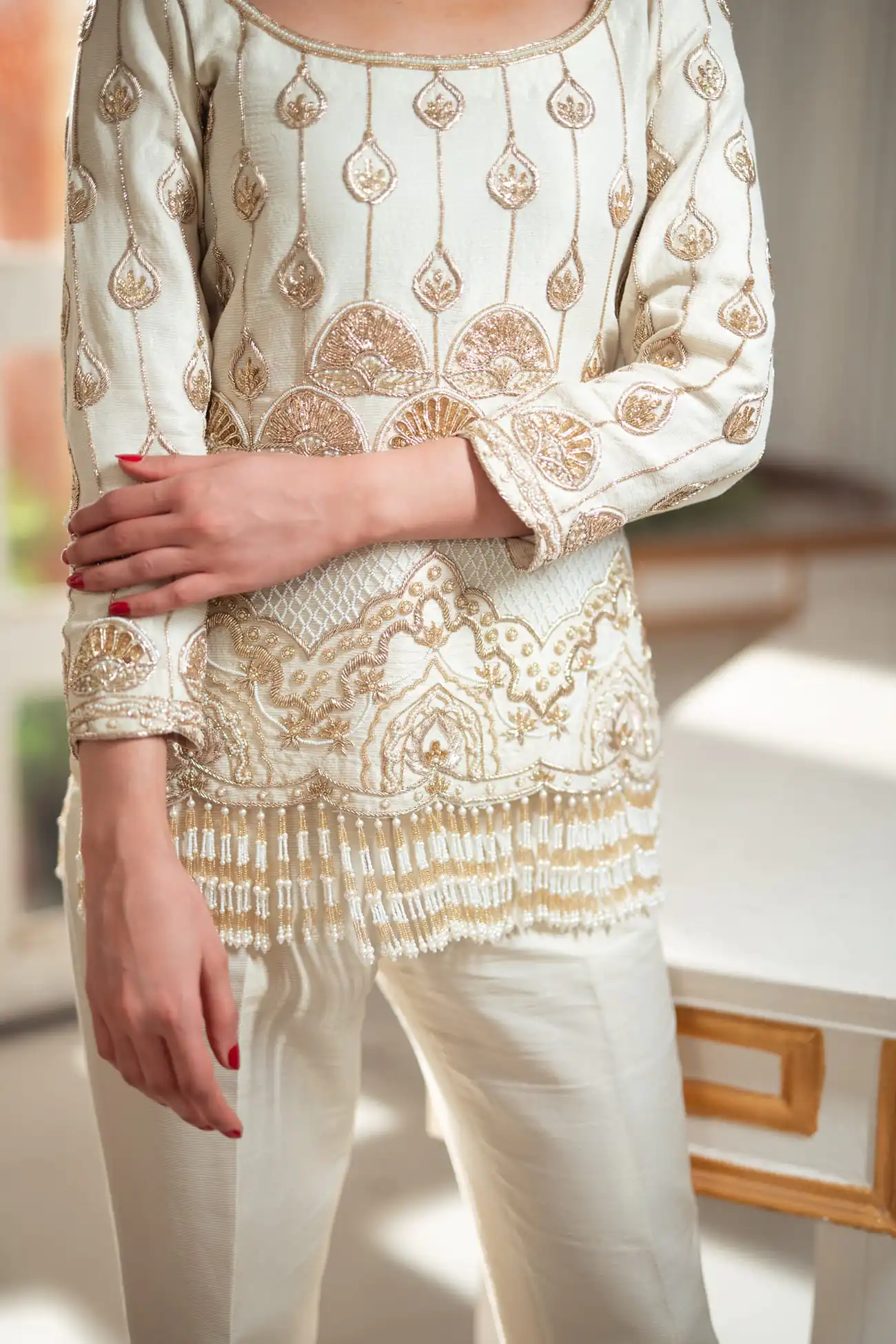 Crafted for ceremonial elegance, the Royal Gold Radiance Bandhgala by Simran Dhillon is tailored in a luxurious ivory jacquard base, highlighted with intricate golden embroidery along the placket, cuffs, and hemline. The rich texture and refined detailing evoke a regal aura, making it a perfect choice for engagements, weddings, and high-formal occasions.