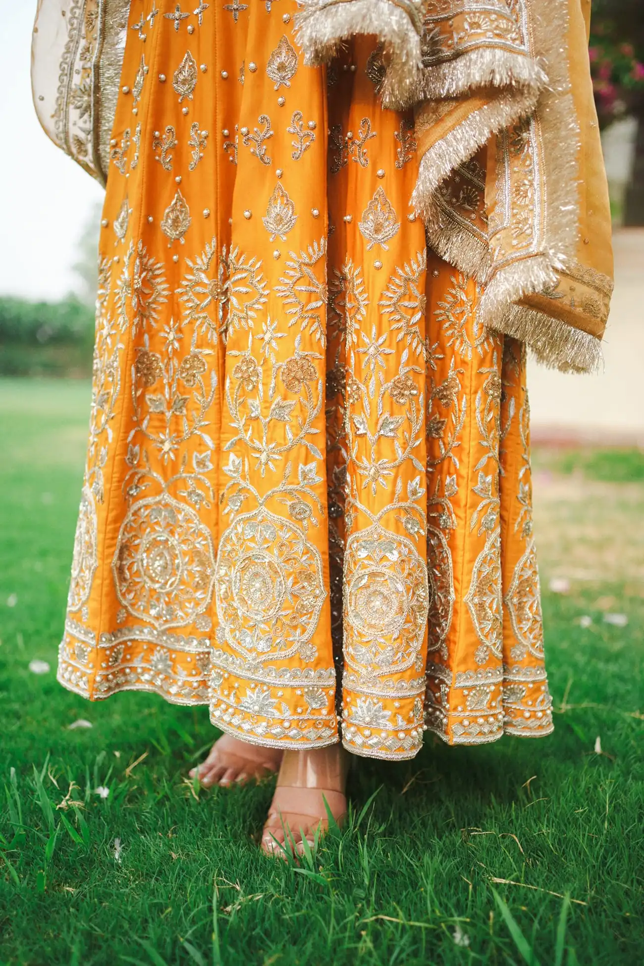 Self orange achkan its sewing pattern compliment its paired with churidaar pyjami perfect for any mehehndi and haldi function.